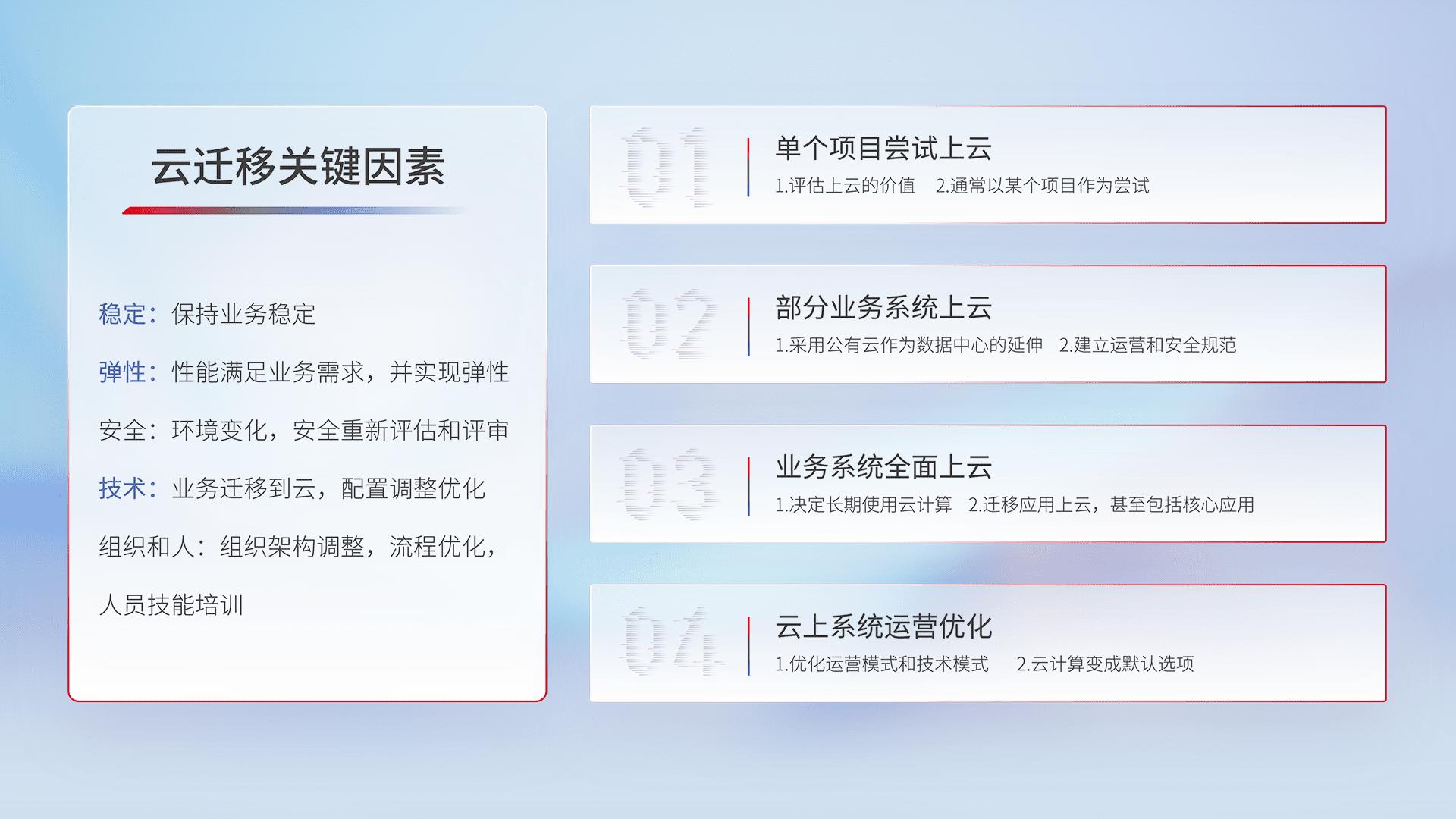 结合实际业务,,,,从规划设计、、云平台选型、、云原生改造、、、数据迁移、、集成交付,,,,迁移全过程为客户识别最佳上云路径,,,,做好风险识别管理,,,设计网络架构、、身份权限、、、安全审计合规、、操作审计、、、、日志审计、、、监控告警策略、、、多站点容灾设计等,,对云上基础设施进行整体规划,,提升IT治理水平,,,以满足弹性、、高可用、、、、高性能的需求。。。。