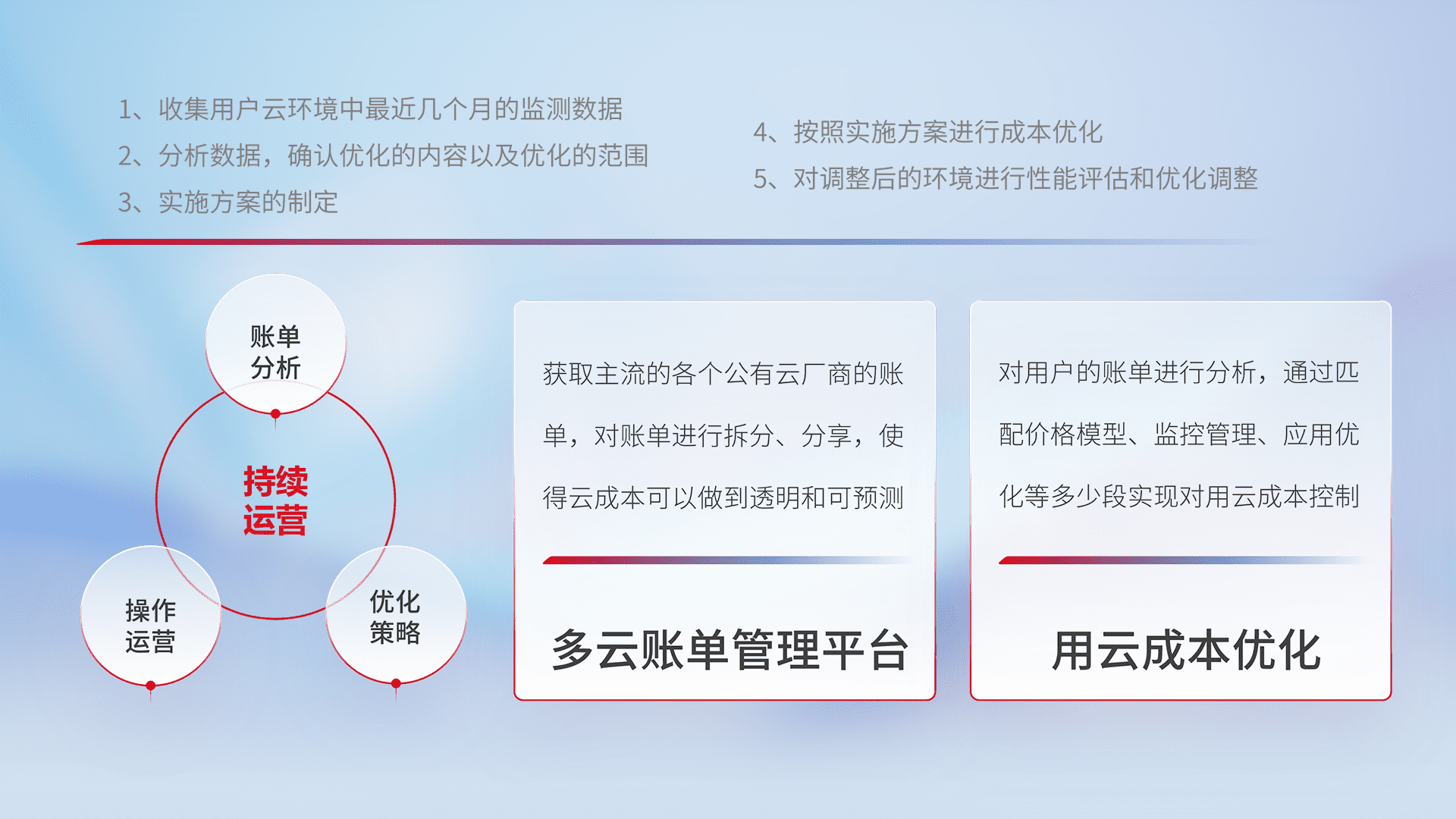 通过多云纳管,,,以统一的资源数据模型把客户的云资源进行抽象和封装,,,进而实现对多云资源的统一操作,,,保障云资源管理的可靠性、、、、稳定性与可用性。。。。量身定制化运维内容,,配置、、、开发运维、、补丁管理、、、、备份、、监控、、、、认证和访问管理、、审计和日常巡检等,,保障在用云过程中的可靠度,,稳定度以及高可用率。。。